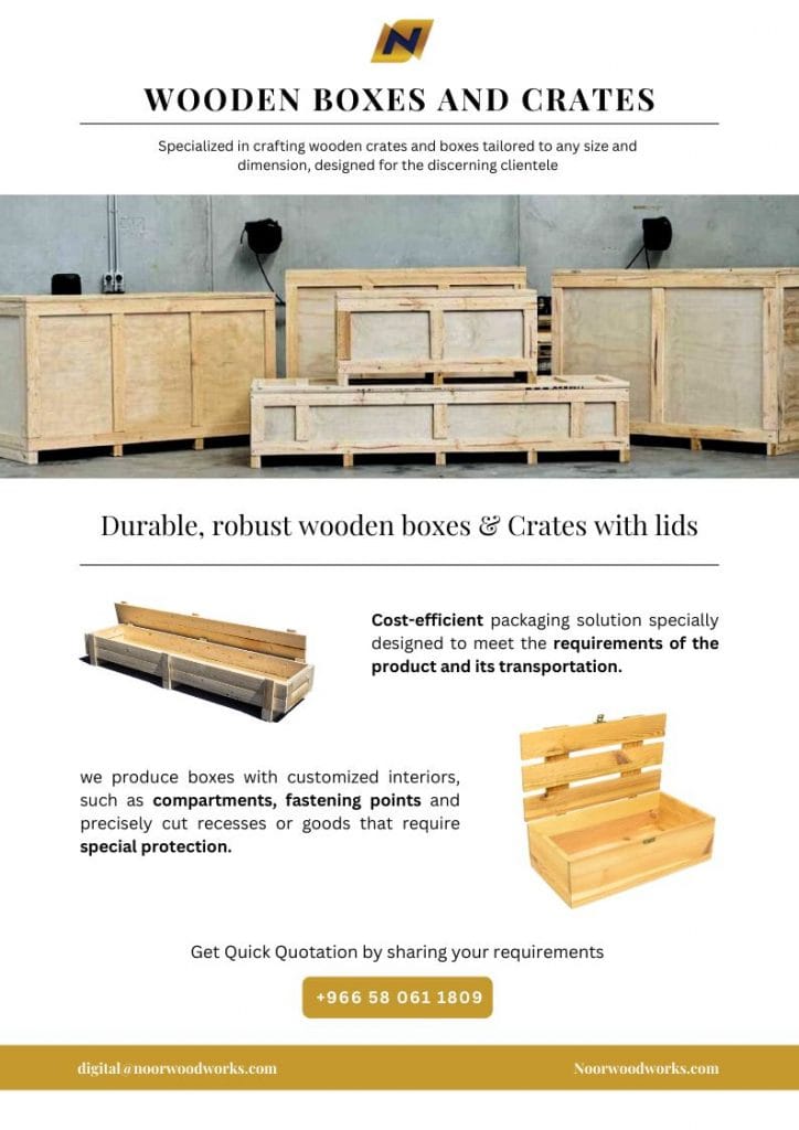 You can purchase from Noor Wood Works directly. We, as a trusted wooden packaging Jubail supplier with fast turnaround times and custom options, can deliver on demand at any time.